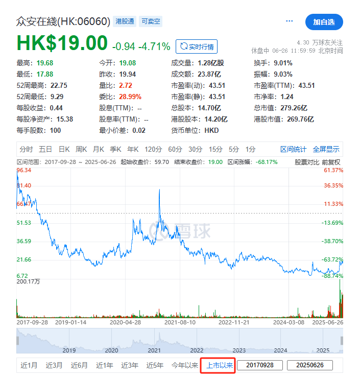 值得留意的是,蚂蚁集团近日刚以每股19.38港元价格配售众安在线约3375万股、套现逾6.5亿港元,其H股持股量由10.01%降至7.63%。蚂蚁在沽货后曾表示,减持属正常投资决策,不影响与众安业务合作,并一如既往看好众安长期发展。